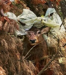 Thomas and Dennis have gone to where the green glowing animal they now knew was a stag had disappeared. I hear a big bang. I think: it must be Tom’s 308 mate, It can’t be Dennis’s gun because it has got a silencer on it. I move off down the gully to catch up to the boys. Coming around the bend I can see Thomas with a stag and it has green bale wrap around its antlers. Thomas has a smile on his face and says, “It’s wrapped to see us Dad.” Dennis is sharpening his knife. He says, “I was really worried  there for a while. It looked like something alien. Thank goodness it wasn’t Predator.” “I’m sure this will taste better than alien.” said Thomas. I agreed. We were amazed at how the silage wrap had bound itself so tightly around the antlers. We had to really cut at the wrap to get it off so we could see the antlers clearly. “Nice head,” says Thomas  with a wry smile. We surmised as to how bale wrap could get so tightly around a deer’s antlers. “He must have been digging his antlers into that big heap of wrapped silage the neighbour has by the edge of the bush.”  says Thomas. “Yeah, I agreed. “As he played with the bales, the wrap has become more entangled on his antlers. I bet he had a great time flicking his head and digging his antlers into the bales. He just kept going as they became more entwined with the wrap.”